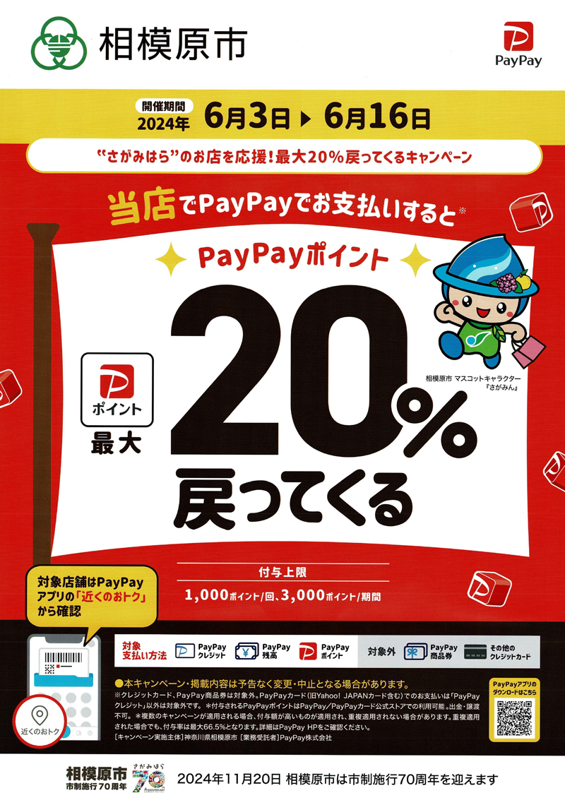 「さがみはらのお店を応援!最大20%戻ってくるキャンペーン」対象店舗に選ばれました!開催期間2024年6月3日~6年16日